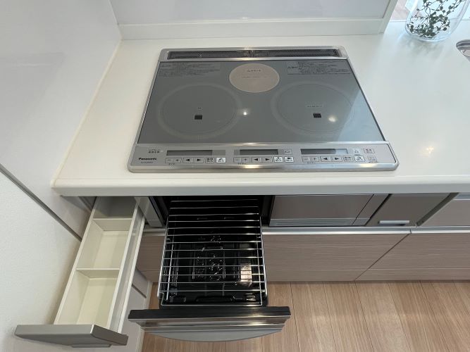 コンロはIHクッキングヒーター3口タイプ、下側に魚焼きグリルが付きます。